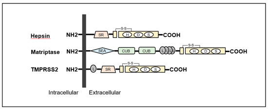 Structures of hepsin, matriptase and transmembrane protease serine (TMPRSS) 2 are shown. All type II transmembrane serine proteases (TTSPs) show single-pass transmembrane proteins with intracellular NH2-terminus and extracellular carboxy-terminal serine protease domains. Hepsin is composed of scavenger receptor (SR) and serine protease domains. Matriptase contains sea urchin sperm protein/enteropeptidase/agrin (SEA) domain, Cls/Cls, urchin embryonic growth factor, bone morphologic protein-1 (CUB) domain, four low-density lipoprotein receptor (L) domains class A and serine protease domains. TMPRSS2 is consists of an L domain, SR, and serine protease domains.