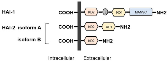 Structures of hepatocyte growth factor activator inhibitor (HAI)-1 and HAI-2 are shown. HAIs show single-pass transmembrane protein with intracellular carboxy-terminus and extracellular specific protease inhibitor domains, the so-called Kunitz domain (KD). HAI-1 is composed of two KDs, L domain, and motif at N terminus with seven cysteines (MANSC) domains. There are two isoforms in HAI-2. Similar to HAI1, HAI-2 isoform A has two KDs, whereas isoform B has a single KD.