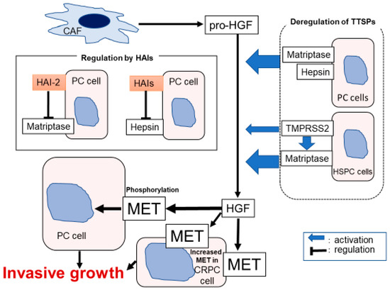 The interaction between cancer cells and stromal cells in the pericellular microenvironment has been fully discussed in the literature [1,2]. On the cancer cell surface, a variety of receptors for cytokines, growth factors, and protease activating-type receptor are widely expressed. The corresponding ligands (such as cytokines and growth factors) are provided from blood cells, stromal cells, and cancer cells in various situations. Among these, several growth factors must be proteolytically activated to achieve the biological activities. Recently, the activating process has been clarified. For example, hepatocyte growth factor (HGF) is secreted as an inactive zymogen (pro-HGF) by stromal fibroblasts and converted to active mature form by proteolytic cleavage [2,3,4]. HGF activator (HGFA) was initially identified and considered to be the single major activator in serum [3,4,5,6,7]. Indeed, coagulation cascade is initiated in pericancerous lesion, and then HGFA changes to the active form by thrombin-induced proteolytic activation [3,4,5,6,7]. Subsequently, several cell-surface transmembrane-type activators, including hepsin and matriptase, were identified [8,9,10,11,12]. These proteases may also be candidates for major activators considering HGF behavior (the so-called sticky protein) and the functional location (MET is located on the cell membrane). In physiological condition, the activation is tightly regulated by specific cell-surface protease inhibitors such as HGFA inhibitors (HAIs). However, dysregulated overactivation of pro-HGF has been reported to aggressively induce cancer invasion and metastasis through increased phosphorylation of MET [10,11,12]. This review focuses on the cell-surface pro-HGF activation system in urological cancers, including prostate cancer (PC), renal cell carcinoma (RCC), and urothelial carcinoma (UC) of bladder, and summarizes its significance in the progression of cancer.