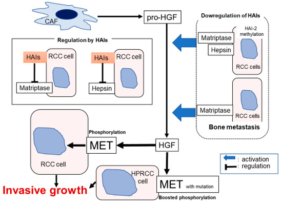Hypothetical model of pericellular activation of pro-HGF in renal cell carcinoma (RCC) is shown. Downregulation of HAIs including HAI-2 methylation induced overactivation of matriptase and hepsin. In bone metastasis, increased expression of matriptase and downregulation of HAI-2 leads to the upregulation of HGF activation. In addition, phosphorylation of MET with auto-activating mutation was enhanced by HGF stimulation.