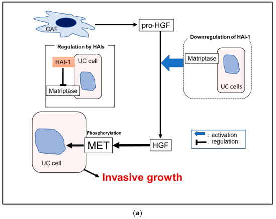 Pathological analysis shows that approximately 90% of bladder cancers are UC and that 5% are squamous cell carcinoma [95]. Several studies reported a positive correlation between increased expression of MET and high tumor grade, pathological staging, and survival [96,97,98,99,100]. Phosphorylation was also analyzed by immunohistochemistry [97,98]. Increased phosphorylation of Tyr1234/1235 (at activation loop) and Tyr1349 (at multi-docking site) was positively correlated with pT stage, and multivariate analysis prompted the authors to conclude that phosphorylated Tyr1349 was a significant predictive factor of pT stage only. In addition, phosphorylated Tyr1349 was correlated with expression of matrix metalloprotease (MMP)-2, MMP-7, and E-cadherin [97]. Furthermore, the relationship between increased phosphorylation of Tyr 1235 in MET and worse cancer-specific survival in patients with muscle invasive bladder cancer (MIBC) was reported by Yamasaki et al. In this study, increased expression of matriptase and decreased expression of HAI-1 were also correlated with poor prognosis [98]. Interestingly, the area of HAI expression and MET phosphorylation presented reciprocally in spite of the strong expression of both total MET and matriptase (Figure 6b) [98]. These findings suggested that HAI-1 may regulate the ligand-dependent activation of MET in patients with MIBC. As a biomarker, the utility of urinary soluble MET concentration to detect bladder cancer and MIBC was reported [101,102]. In vitro analysis, efficient suppression of invasion and proliferation by cabozantinib (dual inhibitor of MET and VEGFR) was observed in invasive UC cell lines (5637, T24) [103]. HGF/MET signaling-induced expression of MMP-1 was also suppressed by cabozantinib in the same cell lines. HGF/MET signaling-induced EMT is a major phenomenon in various cancer cells [103]. Recently, it has been reported that HGF/MET signaling-induced inhibition of SMURF2 yielded stabilization of TGF-β receptor, and that upregulation of TGF-β signaling axis leads to EMT of UC cell line [104]. However, compared with PC and RCC, the function of TTSPs and HAIs in UC is not well known. Therefore, further analysis is required.