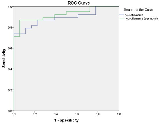 The normalized NFL values gave better specificity and sensitivity (uncorrected for age area under the curve (AUC) AUCNFL = 0.890 and corrected for age AUCNFLc = 0.923, respectively, Figure 2).