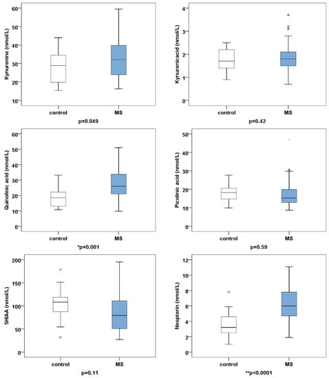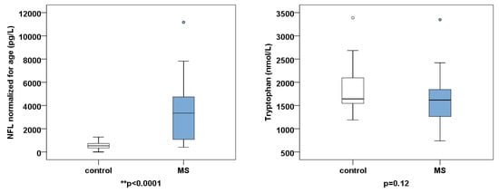 Boxplots of neurofilament light chain (NFL), tryptophan, kynurenine pathway metabolites, and neopterin. The values are given as mean ± SD.* p < 0.00625, ** p < 0.0001. Abbreviations: 5HIAA—5-hydroxy-indolacetic acid, MS—multiple sclerosis.