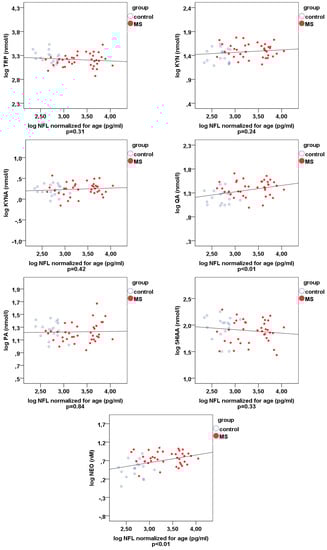 NFL proved to be an independent parameter in the MS group. The correlations between the different metabolites and NFL are shown in Table 3 and in scatterplots in Figure 4. Correlations of 0.01 level significance were found between NFL and QUIN, NFL and neopterin (NEO), kynurenine (KYN) and NEO, QUIN and NEO, KYN and QUIN, and kynurenic acid (KYNA) and 5-hydroxy-indolacetic acid (5HIAA). Correlations of 0.05 significance level were detected between KYNA and QUIN, and between tryptophan (TRP) and QUIN. The correlations between KYNA and 5HIAA, KYN and QUIN, KYNA and QUIN, as well as between TRP and QUIN, are most probably due to the downstream metabolism, which explains these connections. More interestingly, there was a strong positive correlation between NFL, QUIN and NEO, and between KYN and NEO, which points to a positive correlation between the biomarkers of neuroinflammation and axonal degeneration. The only negative correlation was found between TRP and QUIN, which most probably indicates an increased formation of QUIN from the precursor, TRP.