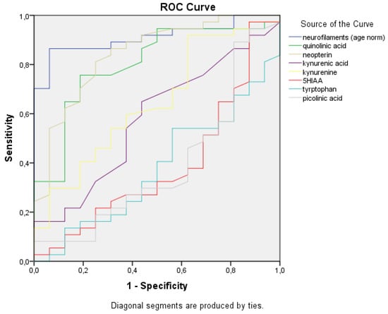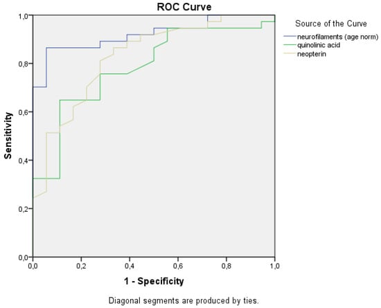 ROC curves for corrected NFLs together with QUIN and neopterin. ROC curves of the best fitting parameters yielding high sensitivity and specificity: NFL, quinolinic acid, and neopterin.