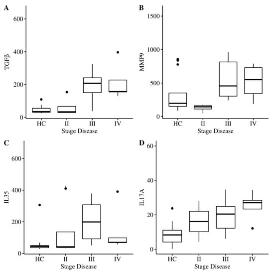 Box–whisker graphs of TGFβ (panel A), MMP9 (panel B), IL-35 (panel C), and IL-17A (panel D) in the HC and patients in three stages of disease. Box–whisker plots show 25th and 75th percentile range (box) with 95% confidence interval (whiskers) and median values (transverse lines in box).