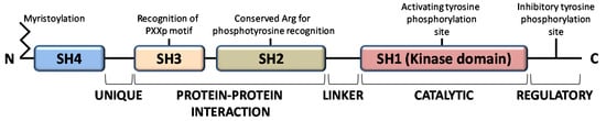 The members of the Src family of protein tyrosine kinases (SFKs) are expressed in all mammalian cells, where they are implicated in pivotal physiological cellular processes as proliferation, migration, differentiation and survival, as well as in pathological cancer onset and progression, when overactivated. These are non-receptor tyrosine kinases that, once activated by external stimuli acting on receptors for growth factors, cytokines, steroid hormones, on G protein-coupled receptors and adhesion proteins, start a signaling cascade leading to widespread effects []. The family consists of eleven members, among which Src is the prototype enzyme: the members of the main group (Src, Yes, Fyn, Fgr, Blk, Hck, Lck, and Lyn) are closely related, while Frk, Srm, and Brk constitute a more distantly related group. Among them, Src, Yes, and Fyn are expressed in mammals in a ubiquitous manner, while the expression pattern of the other members is tissue and/or cell restricted []. These SFKs share high homologous structure consisting of four consecutive Src Homology (SH) domains: an SH4 membrane-targeting region at their N-terminus, that can be myristoylated and/or palmitoylated to allow membrane localization; an intrinsically disordered unique domain, which exhibit strong sequence divergence among SFK members; the regulatory SH-2 and SH-3 domains precede a large catalytic C-terminal domain (SH1) with the hallmark of Src kinases, an autoinhibitory phosphorylation site that is the Y527 residue in human Src (Figure 1) [].