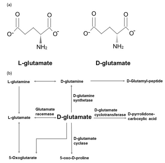 (a) l-glutamate and d-glutamate. (b) d-glutamate metabolic pathways.