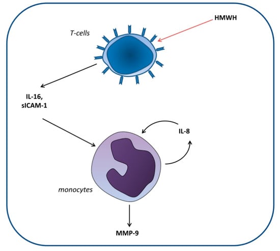 Huber et al. [22] set out to elucidate the cellular mechanisms involved in the differential effect of high-molecular-weight heparin (HMWH) compared with that of other anticoagulants on MMP-9 blood levels. For this purpose, monocytic and T and B lymphocytic cell lines were cocultured. The researchers demonstrated that HMWH increased IL-16 and sICAM-1 secretion by T lymphocytes, which in turn increased IL-8 and MMP-9 production by monocytes (Figure 2).