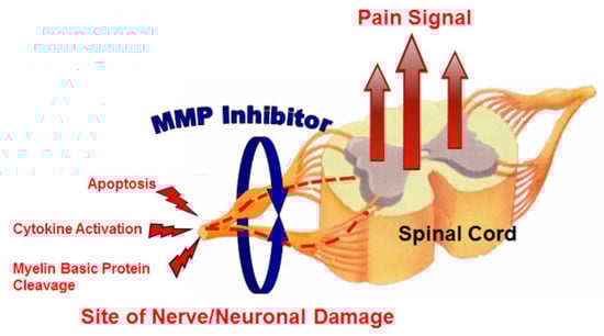 Neuropathic pain is very difficult to treat, and there is an unmet medical need for effective therapeutic approaches. Kwan et al. [23] evaluated the effect of MMP-2/MMP-9 inhibition on neuropathic pain (Figure 3). They used an orally bioavailable MMP-2/MMP-9 inhibitor (AQU-118) in the spinal nerve ligation rodent model of neuropathic pain and discovered a novel relationship between elevated MMP-2 mRNA expression levels and caspase-3-mediated cell death, once again highlighting the complex interactions of MMPs with other proteinases within the proteinase network.