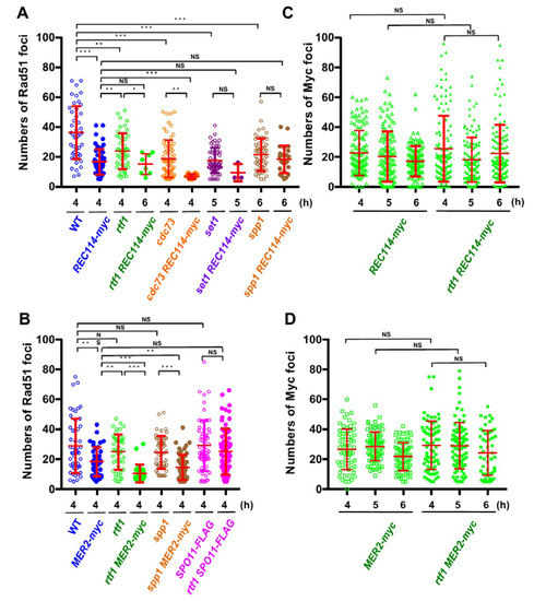 The REC114-myc showed a synthetic defect in Rad51-foci formation with histone modification mutations. (A,B) Distribution of Rad51 foci numbers. The number of Rad51 foci in foci-positive nuclei (with more than 5 foci) in strains with the REC114-myc (A) and the MER2-myc and SPO11-FLAG (B) at indicated times were counted. At each time point, 42 spreads from three independent time courses (n = 126; 42 × 3) were analyzed. * p < 0.05; ** p < 0.01; *** p < 0.001. NS shows Not Significant. The p values and statistics for Rad51-foci numbers in foci-positive nuclei are shown in Table S2. The strains used are shown in Figure 1A. spp1 MER2-myc, ZYY1030; SPO11-FLAG ZYY1031; rtf1 SPO11-FLAG, ZYY1032. (C,D) Distributions of Rec114-myc- and Mer2-myc-foci numbers at 4, 5, and 6 h are shown. In REC114-myc (C), the number of myc foci in all spreads is shown. In MER2-myc (D), the number of myc foci in foci-positive nuclei (with more than 5 foci) is shown. At each time point, 42 spreads from three independent time courses (n = 126; 42 × 3) were analyzed. The p values and statistics are shown in Table S2.