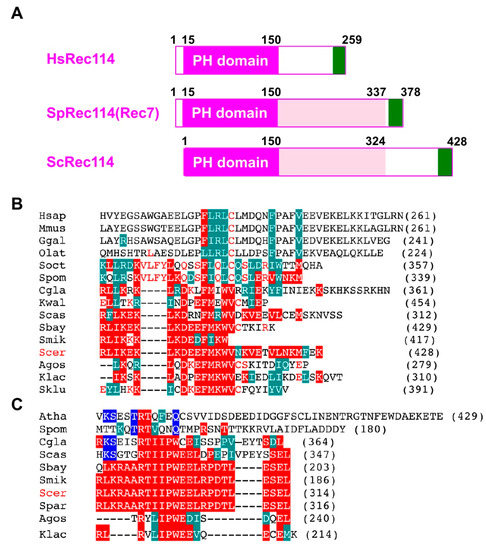 The fact that the C-terminal myc-tag on Rec114 and Mer2 affects function, suggests an important role of the C-terminal region of proteins. Recent studies identified orthologs of S. cerevisiae Rec114 and Mer2 proteins from different yeasts to mammals [35,36]. The N-terminal ~140 aa of Rec114 contains a conserved PH domain (Figure 5A), whose crystal structure adapts β-sandwich folds [35,36]. We found that an ~33 aa region in the Rec114 C-terminus is also conserved among some yeasts (Figure 5B). This region also shares similarity to the C-terminal region of Rec114 in fission yeast (a.k.a. Rec7) and vertebrate Rec114 orthologs (Figure 5B). Moreover, the C-terminus of S. cerevisiae Mer2 protein is conserved among some yeast species (Figure 5C) with weak homology to Mer2 orthologs in S. pombe (Rec15) and in Arabidopsis thaliana (PRD3). These regions of both Rec114 and Mer2 are rich in acidic and basic amino acids. These support an idea that the C-terminal regions of Rec114 and Mer2 are very important for its activity, such as in protein–protein interactions. Interestingly, Kumar et al., (2010) showed the C-terminal region of mouse Rec114 binds to another RMM component, Mei4 [37]. The C-terminal myc-tagging of Rec114 and Mer2 might affect such a function.