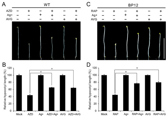 2.4. Ethylene Inhibitors Relieve Hypocotyl Growth Inhibition under TOR Inactivity