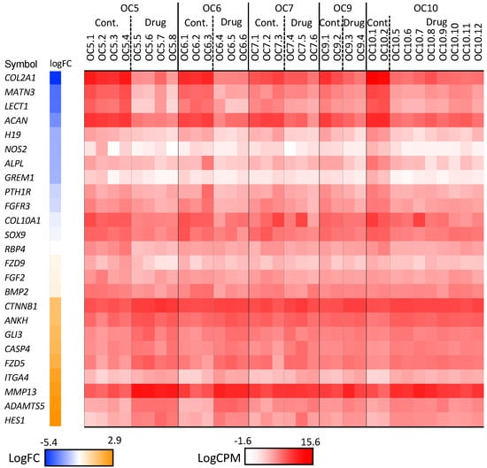 Log counts per million (CPM) histogram of genes listed in the osteoarthritis pathway identified by the IPA. The RNAseq data from OC5, OC6, OC7, OC9 and OC10 were combined and analyzed. A total of 395 genes were up-regulated and 598 genes were down-regulated. The DEGs (criterion false discovery rate (FDR) ≤ 0.05 and the log2 fold change (LFC) cutoff values of +/− 1) between retinoic acid receptor gamma (RARγ) agonists treatment and control groups were analyzed to identify canonical pathways by IPA. Heatmap indicates the sample differences of DEGs listed in the osteoarthritis pathway. OC5: OC5.1–5.4, control; OC5.5–5.8, 300 nM NRX204647. OC6: OC6.1–6.3, control; OC6.4–6.6, 300 nM NRX204647. OC7: OC7.1–7.3, control; OC7.4–7.7, 300 nM NRX204647. OC9: OC9.1 and 9.2, control; OC9.3 and 9.4, 300 nM NRX204647. OC10: OC10.1 and 10.2, control; OC10.5 and 10.6, 50 nM NRX204647; OC10.7–10.9, 300 nM NRX204647; OC10.10–10.12, 300nM Palovarotene.