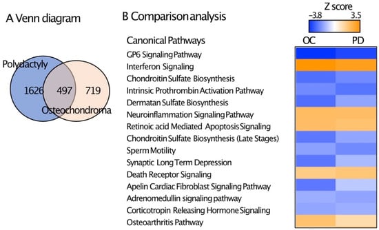 Comparison of DEGs between control and RARγ-agonist treatment groups of osteochondroma explants with those of polydactyly chondrocyte cultures. The DEGs (criterion FDR ≤ 0.05 and the LFC cutoff values of +/− 1) between RARγ agonists treatment and control groups were analyzed in the osteochondroma explant cultures (OC10) and human polydactyly chondrocytes. (A) Venn diagram analysis of DEGs of osteochondroma explants and polydactyly chondrocyte cultures. (B) Canonical pathways highly ranked by the comparative analysis of IPA.