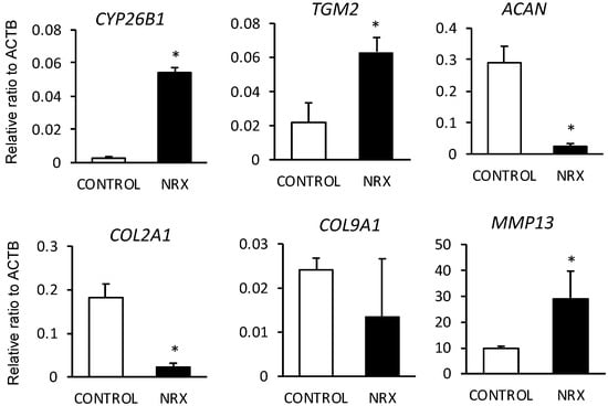 Gene expression analyses of RARγ agonist treatment and control groups of osteochondroma explant cultures. The osteochondroma explants (hOC7) were treated with vehicle (CONTROL, 0.1% ethanol) and 300 nM NRX204647 (NRX) in DMEM containing 2% charcoal-treated FBS (n = 3). Total RNAs were prepared and subjected to qPCR to examine gene expression levels of CYP26B1, TGM2, ACAN, COL2A1, COL9A1 and MMP13. The values were normalized by ACTB value and then calculated as a relative ratio to the control average. The values are average and standard deviation (SD). * p < 0.05 versus control.
