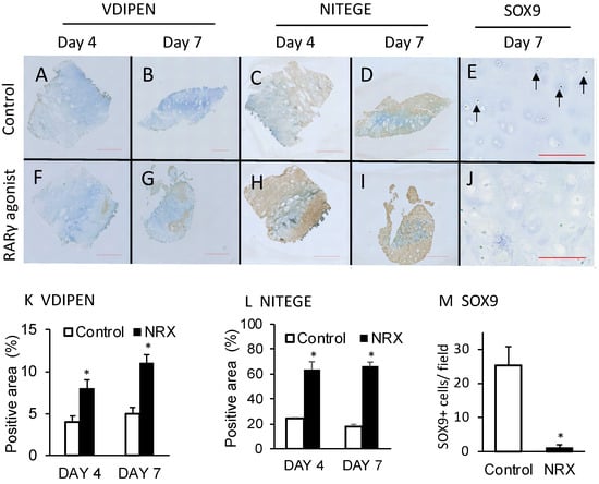 Stimulation of aggrecan degradation and inhibition of SOX9 expression by RARγ agonists in osteochondroma explant cultures. The osteochondroma explants were treated with vehicle (Control, 0.1% ethanol) (A–E) or 300 nM NRX204647 (RARγ agonists) (F–J) in DMEM containing 2% charcoal-treated FBS (n = 3). The explants were fixed with 4% PFA 4 or 7 days after treatment and subjected to immunohistochemical staining using anti-VDIPEN, NITEGE or SOX9 antibodies. The staining results were quantified by Cell Hybrid Count function in BZX-700 (K–M) The values are average and standard deviation (SD). * p < 0.05 versus control. Bars are 2 mm for A-I and 200 μm for (E) and (J).
