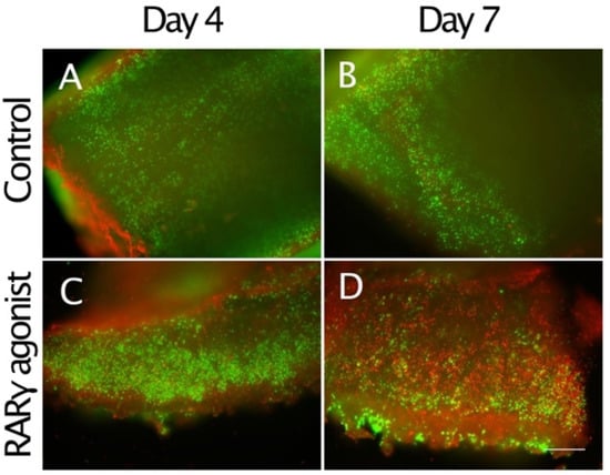 Alteration of the osteoarthritis pathway due to RARγ agonist treatment was associated with the up-regulation of catabolic genes (ADAMTS5, HES1, and MMP13), inhibition of cartilage matrix anabolic genes (COL2A1, ACAN, and SOX9) and the up-regulation of death genes (CASP4) (Figure 2). These results indicate that RARγ agonists tend to destroy the cartilage of osteochondroma explants. To further examine this finding, we stained the sections with antibodies (VDIPEN and NITEGE) against the neo-epitope of aggrecan produced by MMPs and ADAMTSs, respectively. An increase in staining for VDIPEN and NITEGE neoepitope of aggrecan was observed (Figure 5). In contrast, SOX 9 immunoreactivity was detected in the control sample while it was hardly visible in the RARγ-treated samples (Figure 5J). Interestingly, RARγ agonist treatment-induced cell death as demonstrated by a live/dead assay. An increase in the number of dead cells by the drug treatment was not detected on day 4 while it became very evident on day 7 (Figure 6).