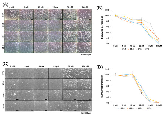 Cytotoxicity assay of 18α-glycyrrhetinic acid (AGA) and T0070907. Representative microscopic images of tendon-derived stem cells (TDSCs) cultured with various concentrations of (A) AGA and (C) T0070907. 5T-1, 5T-2, 5T-3, and 5T-4 stem cells were collected from different rat specimens as 5-week-old, chemically induced tendinopathy donors. In the same manner, 15T-1, 15T-2, 15T-3, and 15T-4 cells were collected from different rat specimens as 15-week-old, injury-with-overuse tendinopathy donors. TDSCs were cultured with various concentrations (0, 1, 10, 25, 50, 100 μM) for 5 days. Cytotoxicity of (B) AGA and (D) T0070907 was measured by Cell Counting Kit (CCK)-8 assay. The optimal dose of AGA and T0070907 killing less than 50% of TDSCs was 25 μM and 10 μM, respectively. In (B,D), error bars represent the standard deviation of mean.