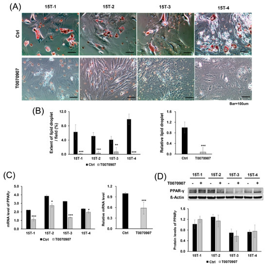 The expression of lipid droplets stained with Oil Red O in the control group was markedly increased, whereas lipid droplets were decreased in the T0070907 group (p < 0.001). Although lipid droplets were observed more in 15T-4 compared to other cells, T0070907 consistently inhibited osteogenic induction in all cells (15T-1, 2, 4, p < 0.001; 15T-3, p < 0.01) (Figure 4A,B).