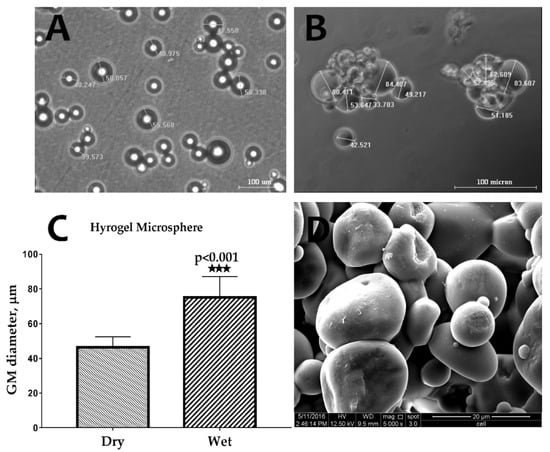 Optical microscope images of gelatin microspheres (GMs) in (A) dry and (B) wet conditions. (C) The swelling measurement of hydrogel microsphere (n = 6) (*** p < 0.001), and (D) an scanning electron microscope (SEM) image of GMs showing the sphericity and smooth surface of the GMs.