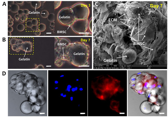 Figure 2A,B are optical microscope images of BMSCs-GM on days 3 and 7. On day 3, BMSCs were well attached to GMs and demonstrated a flattened and elongated morphology. Moreover, GMs are shown to form aggregates, which enlarged at day 7 with extensive cell–cell and cell–matrix interactions (Figure 2B,C). Figure 2C illustrates the BMSCs and GMs under SEM, whereby the BMSCs secreted ECM surrounding the GMs. The fluorescent staining of the BMSCs-GM aggregates showed the formation of actin cytoskeleton, indicating the strong attachment and elongation of the BMSCs over GMs (Figure 2D).