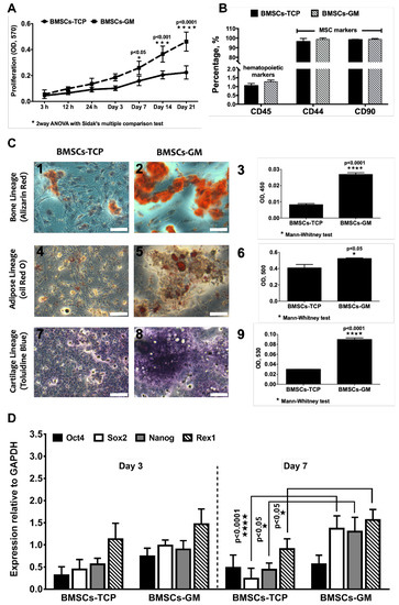 2.3. Proliferation, Characterization, and Differentiation of BMSCs-TCP vs. BMSCs-GM
