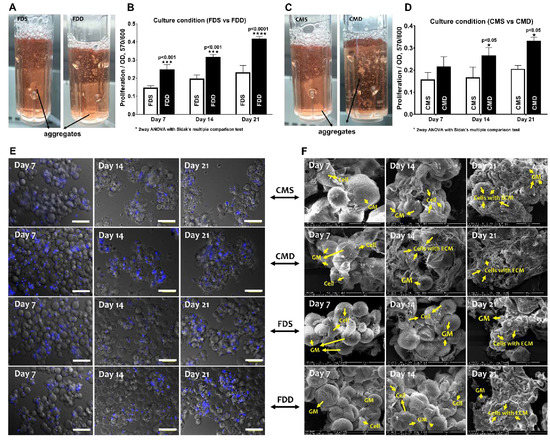 BMSCs attachment and proliferation in the static and dynamic culture system. Evaluation based on the different medium and culture system. (A,B) Macroscopically view and proliferation of BMSCs-GM in FDS and FDD culture condition (C,D) Macroscopic view and proliferation of BMSCs-GM in CMS and CMD culture condition. (E,F) Microscopic view of BMSCs-GM in FDD, FDS, CMD, and CMS. All experiments based on BMSCs-GM incubated in FD and chondrogenic induction medium (CIM) for 7, 14, and 21 days using static and dynamic culture condition (FD-Static (FDS), CIM-Static (CMS), FD-Dynamic (FDD), and CIM-Dynamic (CMD)). The sample size (n) for each experiment was six (n = 6). (E: 100× Magnification; scale bar: 100 µm F: 3000× Magnification; scale bar: 40 µm).