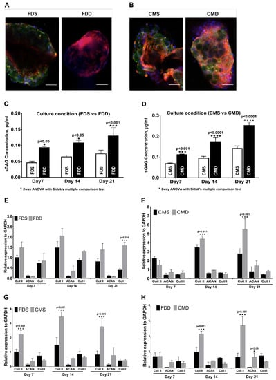 The pictograph from immunohistochemical staining (Figure 5A,B) showed the expression of type II collagen in all culture conditions, whereby culturing in dynamic conditions in both media produced higher type II collagen compared with culturing in static condition. In terms of proteoglycan expression, cultured BMSCs in both FDD and CMD showed a significant increase in the expression of proteoglycan compared to those in FDS with increasing culturing time (Figure 5C,D). Figure 5E,F showed the chondrogenic gene expression analysis in different culture conditions. There were no significant changes in terms of type I collagen, aggrecan, and type II collagen expression between FDS and FDD except that the expression of type I collagen in FDD was significantly higher than in FDS on day 21. For CMS and CMD, the changes in mRNA expression were notable for type II collagen. As shown in Figure 5F, on days 14 and 21, the expression of type 2 collagen in the CMD was significantly higher than in the CMS. Figure 5G,H showed the chondrogenic gene expression analysis in different culture mediums within the same culture condition. There were significant changes (p < 0.001) of type II collagen expression between FDS and CMS with increasing culturing time (Figure 5G). Meanwhile, in Figure 5H, there were no significant changes in terms of type I collagen, aggrecan, and type II collagen expression between FDD and CMD on day 7. However, significant changes in type II collagen were seen on day 14 and 21, respectively.