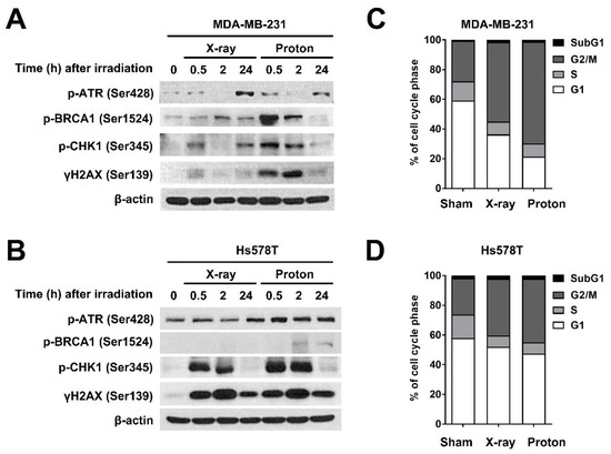 To further understand the biological impact of proton irradiation in TNBC cells, we investigated the differential cell cycle checkpoint activation by X-rays and proton irradiation in two different TNBC cell lines, MDA-MB-231 and Hs578T. As both cell lines have a mutation in the TP53 gene, an essential gene for the G1/S checkpoint, we focused on the ataxia telangiectasia and rad3-related (ATR)/CHK1 signaling and the G2/M checkpoint. The samples were prepared 0.5 h, 2 h, and 24 h after exposure to 4 Gy of X-rays or protons. Western blotting revealed that in MDA-MB-231 cells, phosphorylation of ATR at Ser428 and BRCA1 at Ser1524 was strongly induced by protons at 0.5 h, with a concomitant increase in γH2AX expression, a surrogate marker for DNA double-strand breaks (DSBs) (Figure 1A). In addition, protons increased the phosphorylation of CHK1 at Ser345 to a greater extent than X-rays (Figure 1A). In Hs578T cells, there was a substantial increase in the phosphorylation of CHK1 and H2AX in response to both radiations. However, the difference between the two radiations was less pronounced in Hs578T cells than that in MDA-MB-231 cells (Figure 1B). Cell-cycle analysis showed that both radiations increased the cell population at the G2/M phase with a decrease in the G1 phase population in TNBC cells (Figure 1C,D). The effect of protons on the G2/M arrest was more prominent in MDA-MB-231 cells (Figure 1C) than that in Hs578T cells (Figure 1D). These data indicate that proton irradiation leads to the activation of CHK1 to a greater extent than that induced by X-rays, possibly due to more complex DNA damage, thereby resulting in a more pronounced G2/M arrest.