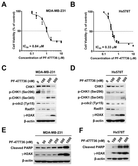 The cytotoxicity of the CHK1 inhibitor, PF-477736 is different in human TNBC cells. Cytotoxic effects of PF-477736 on MDA-MB-231 cells (A) and Hs578T cells (B). Cell proliferation was measured using the Cell Counting Kit-8 (CCK-8) assay kit after 72 h of PF-477736 treatment. Concentration-dependent inhibition of CHK1 activity in response to PF-477736 treatment in MDA-MB-231 cells (C) and Hs578T cells (D). Cells were incubated with the indicated concentrations of PF-477736 for 48 h. β-actin was used as a loading control. Concentration-dependent cellular damage in response to PF-477736 treatment in MDA-MB-231 cells (E) and Hs578T cells (F). Cleaved polymerase (PARP) and γ-H2AX were used as markers of apoptosis and DNA damage. β-actin was used as a loading control.