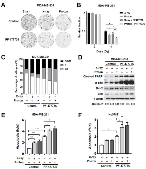 Furthermore, we found that treatment with 500 nM PF-477736 increased the levels of pro-apoptotic proteins such as Bcl-2-associated X (Bax), phospho-p38, and cleaved PARP in MDA-MB-231 cells, which were further enhanced in response to combinatorial treatment with PF-477736 and 6 Gy of either X-rays or protons (Figure 3D). The densitometric analysis showed that the Bax/B-cell lymphoma 2 (Bcl-2) ratio was the highest upon co-treatment with protons and PF-477736. Analysis of apoptosis using annexin V/propidium iodide double-staining confirmed that apoptosis of MDA-MB-231 cells was significantly increased in response to irradiation with either X-rays (p < 0.001) or protons (p < 0.001; Figure 3E). Further, treatment with 500 nM PF-477736 increased the number of apoptotic cells (p < 0.001), which was further increased upon combination with the two radiations (p < 0.05). However, no significant difference between the combinatorial treatments using either proton or X-ray irradiation was observed with respect to the number of apoptotic cells (Figure 3E). In Hs578T cells, treatment with 100 nM PF-477736 induced apoptosis (p < 0.05) and both radiations enhanced apoptosis when combined with 100 nM PF-477736 (p < 0.05 and p < 0.01 for X-rays and protons, respectively; Figure 3F). MDA-MB-453 cells also showed enhanced apoptotic cell death in response to combinatorial treatment with 100 nM PF-477736 and protons (Figure S1C).