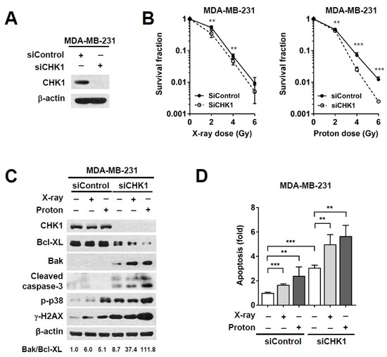 CHK1 silencing using small interfering RNA (siRNA) sensitizes MDA-MB-231 cells to proton irradiation. (A) siRNA-mediated CHK1 knockdown was confirmed using western blotting. MDA-MB-231 cells were treated with 10 nM siRNA, and CHK1 levels were determined after 24 h. β-actin was used as loading control; (B) The clonogenic survival assay showed that siRNA-mediated CHK1 knockdown resulted in enhanced proton radiosensitivity of MDA-MB-231 cells. Data are shown as mean ± S.D. from two independent experiments. ** p < 0.01; *** p < 0.001; (C) Western blot showed that CHK1 knockdown using siRNA further increased the radiation-induced pro-apoptotic signaling. Cells were treated with 10 nM siRNA for 24 h, followed by irradiation with 4 Gy of X-rays or protons. Cells were harvested 72 h post-irradiation. β-actin was used as a loading control. Densitometric analysis showed increased Bak/Bcl-XL ratio after co-treatment with CHK1 siRNA and protons; (D) Flow cytometric analysis revealed that apoptosis was enhanced in response to combinatorial treatment with CHK1 siRNA and 4 Gy of proton irradiation. Data are shown as mean ± S.D. from two independent experiments. ** p < 0.01; *** p < 0.001.