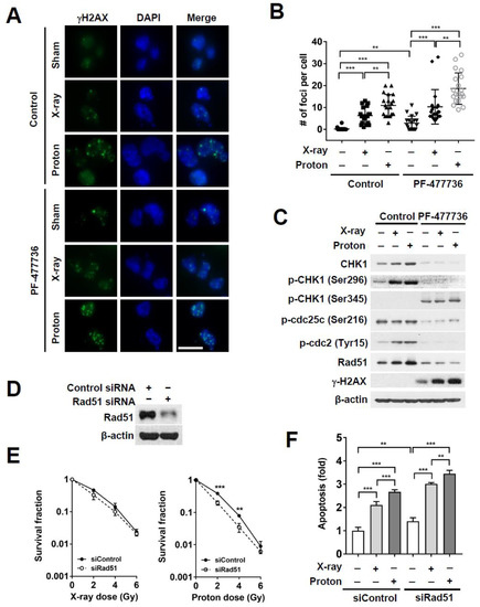 Both X-ray and proton irradiation increased the levels of CHK1 and phospho-cdc2 (Tyr15). However, PF-477736 treatment abolished the increase in levels of these proteins (Figure 5C). The expression of Rad51, a DNA damage repair protein, was markedly reduced in PF-477736-treated cells, regardless of the radiation treatment (Figure 5C). In order to determine whether Rad51 might be implicated in proton sensitization upon CHK1 inhibition, we knocked down Rad51 using RNA interference (Figure 5D). The clonogenic survival assay showed that Rad51 siRNA enhanced radiosensitization of MDA-MB-231 cells to proton irradiation to a greater extent than X-ray irradiation, relative to that observed upon treatment with control siRNA (Figure 5E). Apoptosis assay confirmed that Rad51 knockdown further augmented radiation-induced apoptosis (p < 0.001); in the background of Rad51 knockdown, proton irradiation resulted in a higher number of apoptotic populations than X-ray irradiation (p < 0.01; Figure 5F). Furthermore, treatment with B02, a selective Rad51 inhibitor, increased the level of DNA damage and apoptosis (Figure S3A), leading to proton sensitization, as evidenced by the results of the clonogenic survival assay (Figure S3B,C). These data suggest that the downregulation of Rad51 may be associated with a causal link between CHK1 inhibition and proton sensitization.