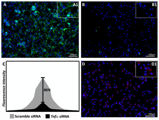 Fluorescence analysis of tumor necrosis factor α (TNFα) (green-labeled) in glial fibroblast cells treated with scramble small interfering RNA (siRNA) (negative control-A) or Tnfα siRNA (B). Shown in (C) is the silencing rate of the fluorescence intensity between the scramble siRNA and Tnfα siRNA (black bar, 96%). In (D) is the positive control of the delivery agent (red-labeled). The fluorescence of nine sites per well, with a total of three wells per treatment, was analyzed by MetaXpress software. Statistical differences in the values of TNFα labeling (A and B) were obtained using Student’s t-test, with the Bonferroni post-hoc test, at a significance level of 5% (p < 0 05).