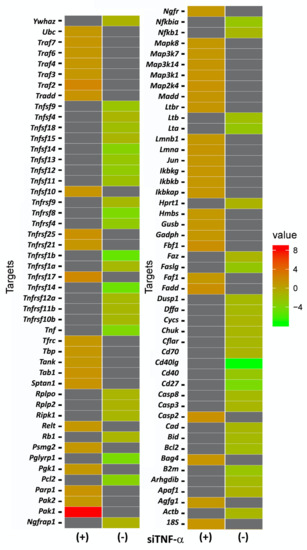 A heat map showing the comparisons of differential gene expression of the TNFα metabolic pathway in the cochleae of rats previously submitted (n = 20) or not submitted (n = 20) to Tnfα siRNA administration and after noise exposure. According to the fold-change found by the qRT-PCR analysis, the “red” color is used to indicate the highest gene expression (up-regulated genes), whereas the “green” color is used to indicate the lowest gene expression (down-regulated genes). In the “gray” color are presented the gene expression values (or transcript values) that were poorly evaluated due to insufficient resolution or image noise, which, in a general way, are named as “missing values”.