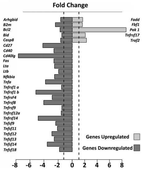 The genes that presented an Rq (fold change) of ±1.2657 were considered up and down-regulated by the Tnfα siRNA administration. Figure 3 shows the main apoptotic genes that were up and down-regulated in the ears submitted to TNFα blockade by gene silencing as compared to the gene expression found in the ears not submitted to gene silencing.