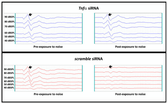 Data was stored in the BioSigRZ System III software (Tucker-Davis Technologies, Alachua, FL, USA) for offline analysis. Means, standard deviations, and adjusted p-values were obtained using Student’s t-test with Bonferroni’s post-hoc test comparing the values of ears that received Tnfα siRNA or noise. Student’s t-test was also used in vitro analysis [53]. The significance level was set at 5%.