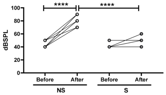 As shown in Figure 5, a higher mean electrophysiological threshold shift was found in the ears not submitted (NS) to the TNFα blockade by gene silencing (n = 20) as compared to the values observed both before the treatment (p < 0.001) and also to the ears submitted (S) to gene silencing (n = 20) (p <0.001).