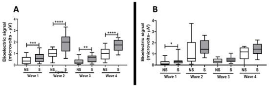 Changes in the wave amplitude and morphology represent auditory responses of the brainstem ascending auditory pathway affected by the cochlear lesion. Peripheral lesions are reflected in the displacement of the auditory thresholds and weaker responses to sound at various levels of the central auditory system, from the cochlear nucleus to the auditory cortex [38]. Corroborating these pieces of information, Popelar et al. [39] demonstrated that the amplitudes evaluated by ABR in rats were significantly altered after noise exposure with the maximal suppression immediately after exposure (measured one-day post-exposure). Similarly to described above, we also found significant alterations. In 80 dBSPL, the wave I amplitude was statistically higher, while at 90 dBSPL, all wave amplitudes were statistically higher in the silenced ears when compared with the non-silenced ears.