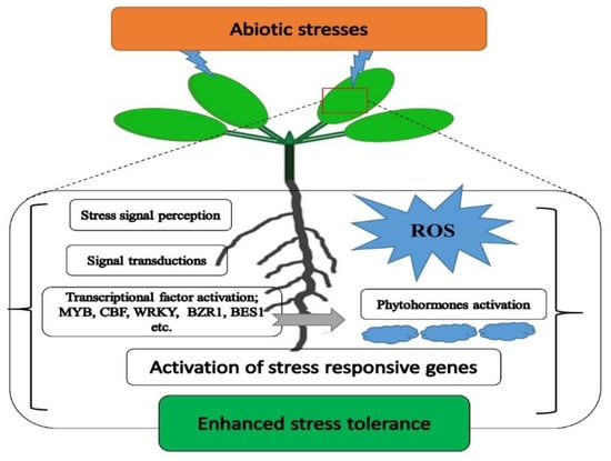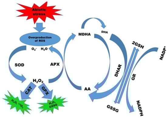 To improve plant survival and production efficiency, different approaches have been established to improve plant resistance [3,5]. The exposure of plants to these environmental stresses leads to reactive oxygen species (ROS) overproduction, which negatively affects the activities of enzymes, the biosynthesis of carbohydrates, DNA, proteins, and other biochemical activities, thus leading to oxidative stress (Figure 1) [6,7]. ROS also influence the expression of a number of genes involved in many processes, including growth, the cell cycle, programmed cell death (PCD), abiotic stress responses, pathogen response, systemic signaling, and development [8]. The defense system (superoxide dismutase (SOD), peroxidase (POD), catalase (CAT), glutathione reductase (GR), ascorbate peroxide (APX) enzymes, etc.) plays a key role in the regulation of the production of ROS and hence protects plants from abiotic stresses [4].