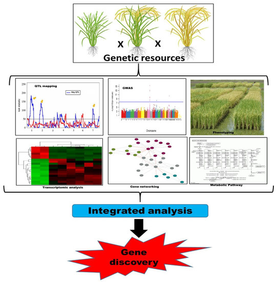 A schematic model for quantitative trait loci (QTL) mapping and the discovery of functional genes for a specific trait. To discover candidate genes for specific traits, a number of plant populations were used as a genetic resource. These resources were QTL mapping, GWAS (genome-wide association study), and transcriptomic analysis to allocate candidate genes for control of a specific character.