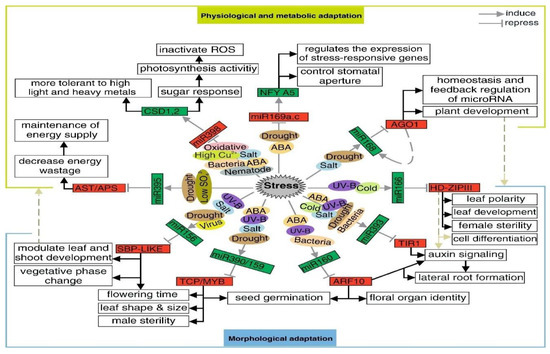 The regulatory mechanisms of miRNAs under abiotic stress conditions in Arabidopsis [32]. The proposed network defines the molecular mechanism of miRNA response to a variety of biotic and abiotic stresses. The network is based on expression profiles and targeted gene transcripts under stress condition.
