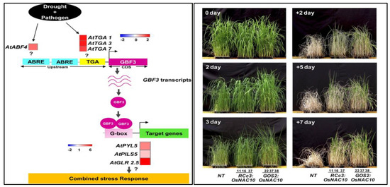 The regulatory mechanism of GBF3 in a combined drought and Pseudomonas syringae stress tolerance [105]. Root-Specific expression of OsNAC10 increased drought stress tolerance and grain yield in rice [96].
