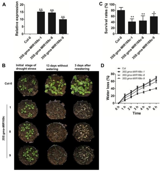 Arabidopsis plants overexpressing the 35S:gma-MIR169c gene show an increased sensitivity to drought stress compared to the wild type * p < 0.05;** p < 0.01 [35].