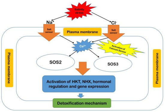 The phosphorylated form of SOS1 plays an essential role in Na+ efflux and contributes to the reduction of Na+ toxicity. Overall, SOS1 functions as an Na+ transporter and mainly exists in the cytosolic compartment of the cell along with the Na+ sensor. Previous studies reported that OsSOS1 of Oryza sativa was isolated based on the homology with AtSOS1 of Arabidopsis [114,133]. Similar to AtSOS1, OsSOS1 encodes a plasma membrane-localized Na+/H+ antiporter, which mediates the active Na+ extrusion in roots under salt stress [133].