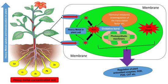 The mechanism of metal stress and oxidative damage in plant cells. Plants uptake an excess amount of heavy metals, which leads to the overproduction of ROS. These ROS cause an oxidative burst and affect a variety of plant biochemical activities in the plant cell.