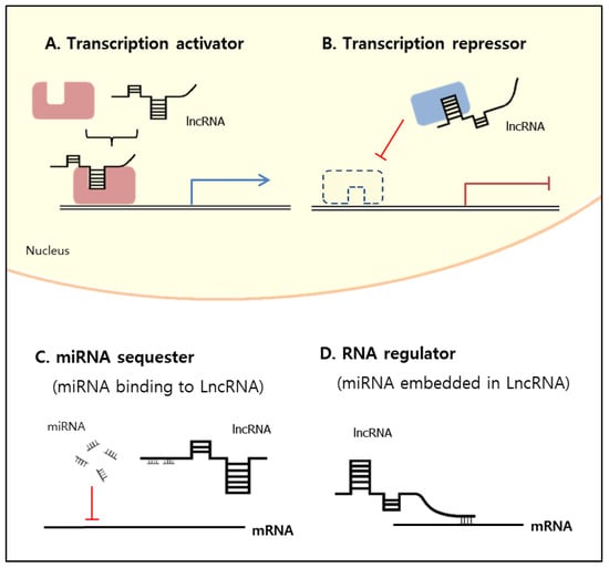 Here, on the basis of previous reports [], we suggest that the presumed molecular mechanisms of lncRNAs are divided into four categories according to their function at the nucleus or cytoplasm (Figure 1): (1) transcription activator, binding to the transcription factor, controls the epigenetic state of particular genes, and is involved in transcriptional regulation in the nucleus (Figure 1A); (2) transcription repressor, also binding to the transcription factor, inhibits gene expression by occupying the DNA-binding site of the transcription factor in the nucleus (Figure 1B); (3) miRNA sequester, binding with miRNAs, causes increased translation efficiency of mRNA in the cytoplasm (Figure 1C); and (4) RNA regulator competes with miRNA-mediated inhibition by, for example, having miRNA embedded in the lncRNA, leading to decreased mRNA expression in the cytoplasm (Figure 1D). There has been, however, no systematic and unambiguous classification of lncRNAs to date, and many existing classifications are conflicting and overlapping [].