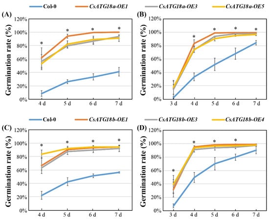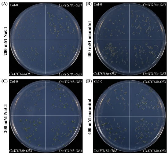 2.4. Overexpression of CsATG18a/b Conferred Osmotic and Salt Tolerance in Arabidopsis
