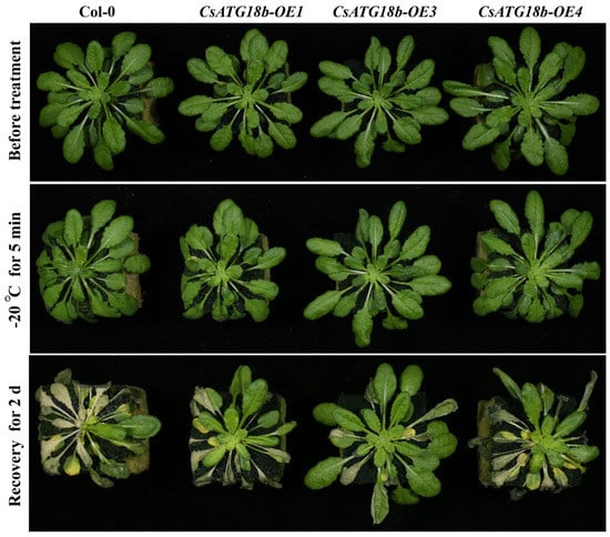 2.6. Overexpression of CsATG18b Conferred Cold Tolerance in Arabidopsis